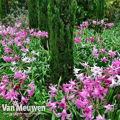 This unique hybrid of Amaryllis belladonna and Nerine bowdenii combines the best traits from both species. Amarine ‘BellaDiva Mixed’ boasts sturdy stems, a vigorous habit, larger blooms and superior hardiness all in one plant. Planted in a sunny, sheltered spot, these stunning Amarines will bring a bright splash of colour from September to November when few other plants are in bloom. The showy flowers are borne on stiffly upright stems before the foliage emerges, making them ideal for cutting. Height: 75cm (30″). Spread: 30cm (12″). Extra Large bulbs supplied (size 20cm+).