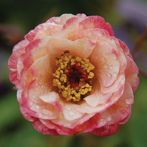 This is such a pretty flower: small and compact, with a centre of yellow anthers surrounded by a frill of creamy-apricot petals etched with veins of pink and an extra blush of intense rosiness at the edges. Geum ‘Cosmopolitan’ is a new variety of Avens which flowers from late spring into summer, loved by bees and other insects for its sweet nectar. With its neat clumps of semi-evergreen leaves, it works well at the front of border. Height: 60cm (24″). Spread: 45cm (18″).
